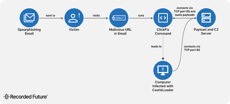 Cluster 1 employs spearphishing campaigns in combination with ClickFix techniques to compromise victims. Figure 5 illustrates a high-level overview of the phishing attack flow.