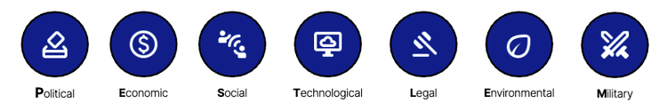 To assess how the Iran conflict could evolve over the next 6–12 months, Insikt Group analyzed regional and global dynamics using the PESTLE-M framework, covering Political, Economic, Social, Technological, Legal, Environmental, and Military domains, with a focus on Iran, the United States, Israel, and Gulf States.