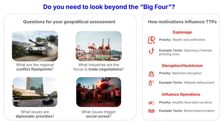 Tracking threat actors beyond the Big Four requires organizations to understand their geopolitical risk in order to anticipate where threats are most likely to emerge. Operating in certain regions or conflict zones likely increases the risk of cyber espionage or destructive attacks.