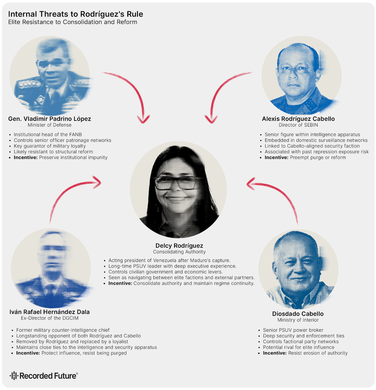 Over the coming months, Delcy RodrÃguez is very likely to prioritize near-term governability and economic stabilization over maximalist ideological positioning, while still finding ways to cooperate with the United States that preserve her rule and credibility inside the ruling PSUV coalition. In the short- to mid-term, the main challenge she faces is the threat posed by internal rivals who may feel threatened by her reforms. This makes her cabinet changes, and evidence of backlash among political and economic elites, crucial variables to watch. In confronting internal threats to her rule, she will likely pursue a strategy of coalition management over one of open confrontation. Even as RodrÃguez continues to consolidate power and tries to keep hardline rivals contained, she will likely avoid high-risk moves that could fracture elite support and risk threatening her relationship with Washington.