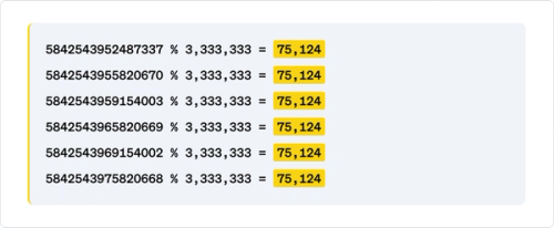 Every ID maps to the same shard: 75,124. They all share the same residue because they are all part of the same arithmetic sequence with a step of 3,333,333.