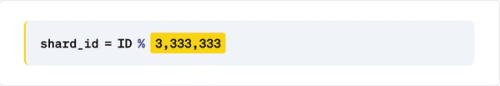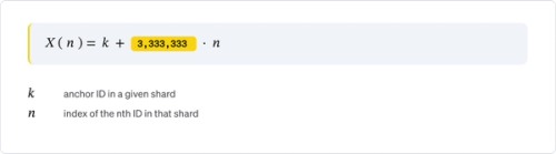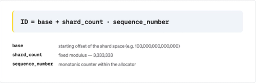 With 3,333,333 shards, each shard is assigned an offset k (where 0 ≤ k < 3,333,333). When a shard needs a new ID, it takes its last ID and adds 3,333,333, stepping over all other shards. This way, every shard generates IDs independently without risk of collision, and all IDs belonging to the same shard share the same residue modulo 3,333,333.