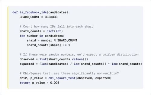 As a single layer, this approach is lightweight and self-contained. It requires no hardcoded ID ranges, no ML model and no context analysis. It's a pure statistical test that exploits the fundamental structure of how Facebook generates IDs. In our classification engine, this sits alongside many other layers (Luhn validation, BIN range checks, context word analysis, ML models, LLM-based classification and more) each catching what the others miss. Even if Facebook's ID space shifts over time, the sharding structure remains, making this particular layer robust and future-proof.