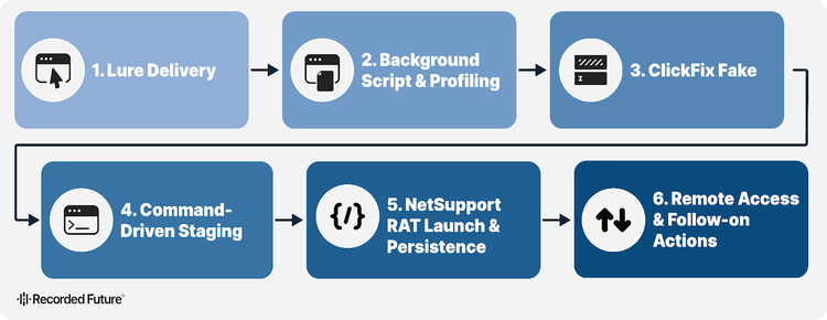 According to public reporting, when GrayCharlie first became active in mid-2023, it relied on fake browser updates to deliver the NetSupport RAT. Although the group later shifted to the ClickFix technique, Insikt Group observed a return to fake browser updates as early as October 12, 2025. Figure 5 provides an overview of Attack Chain 1.