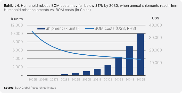 While the production and manufacturing of humanoid robots is complicated and expensive, with each passing year, the cost of producing them is decreasing. Globally, analysts expect the average bill-of-materials (BOM) cost per humanoid robot to decrease to USD 13,000–17,000 by the early 2030s, thereby reducing the average purchasing cost per robot.