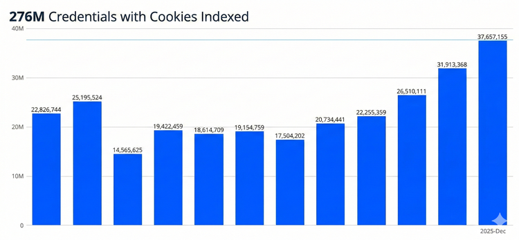 - MFA alone is no longer sufficient protection. 276 million of the credentials indexed in 2025 included active session cookies, meaning attackers can bypass multi-factor authentication entirely. This represents 31% of all malware-sourced credentials.