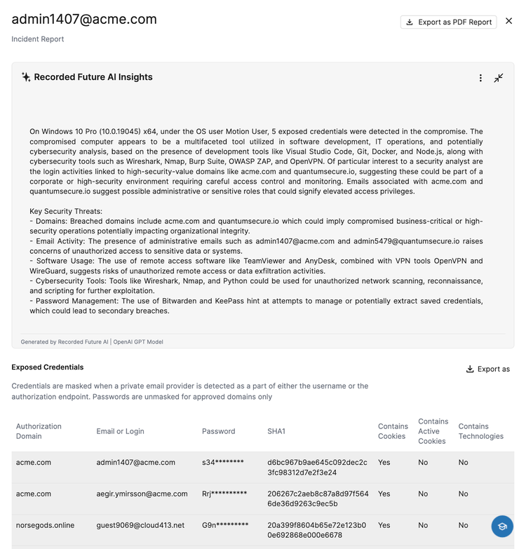 Recorded Future's Compromised Host Incident Reports surface the full scope of each device-level infection, including the malware family responsible, file paths, IP addresses, and infection timelines. This context is what separates actionable intelligence from a list of leaked passwords.
