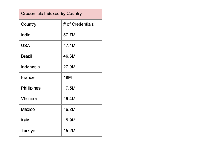 Compromised credentials were indexed from organizations across the globe. The ten countries with the highest credential volume in 2025 were: